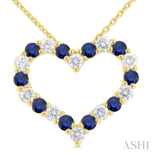 1/2 ctw Open Heart 2.3 MM Round Cut Sapphire and Round Cut Diamond Precious Fashion Pendant With Chain in 14K Yellow Gold