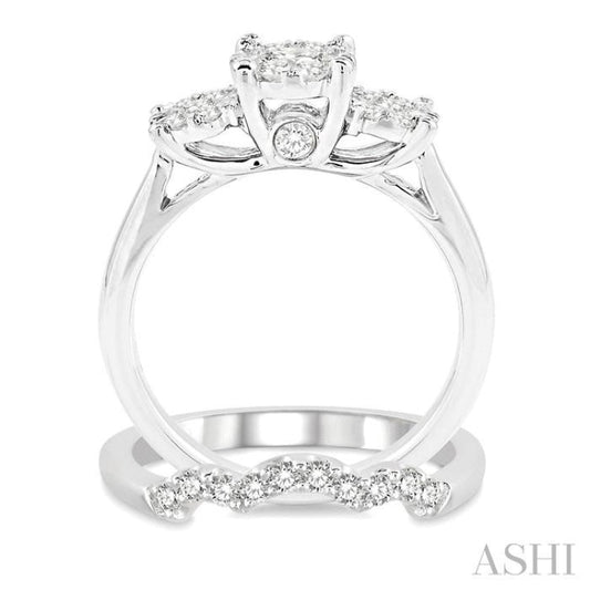 1 1/5 ctw Lovebright Round Cut Diamond Wedding Set With 1 ctw Circular Tri-Head Engagement Ring and 1/5 ctw Tri-Wave Wedding Band in 14K White Gold