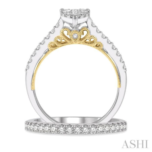 1 Ctw Diamond Lovebright Wedding Set with 3/4 Ctw Pear Shape Engagement Ring in White and Yellow Gold and 1/4 Ctw Wedding Band in White Gold in 14K