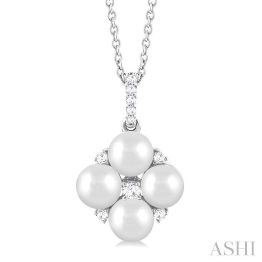 1/10 ctw Floral 5x5 MM Cultured Pearls and Round Cut Diamond Fashion Pendant With Chain in 10K White Gold