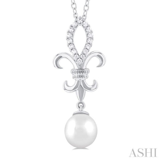 1/10 ctw Fleur De Lis 7X7MM White Cultured Pearl and Round Cut Diamond Pendant With Chain in 10K White Gold