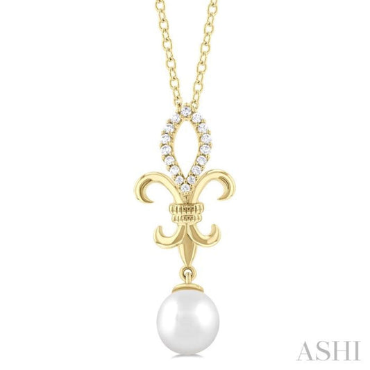 1/10 ctw Fleur De Lis 7X7MM White Cultured Pearl and Round Cut Diamond Pendant With Chain in 10K Yellow Gold