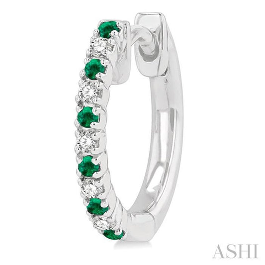 1/10 ctw Petite 1.35MM Emerald and Round Cut Diamond Precious Fashion Huggies in 10K White Gold