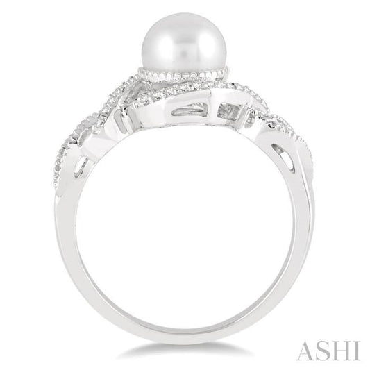 1/10 Ctw Round Cut Diamond and Center 7MM Cultured Pearl Twisted Swirl Ring in 10K White Gold