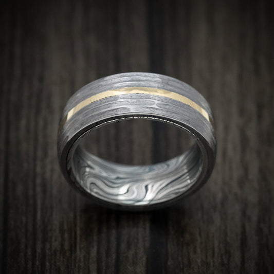 Tantalum and 14K Gold Men's Ring with Marble Kuro Damascus Steel Sleeve Custom Band