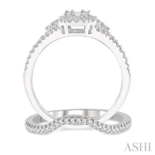 5/8 ctw Fusion Baguette & Round Cut Diamond Wedding Set With 1/2 ctw Emerald Shape Engagement Ring and 1/10 ctw Curved Wedding Band in 14K White Gold