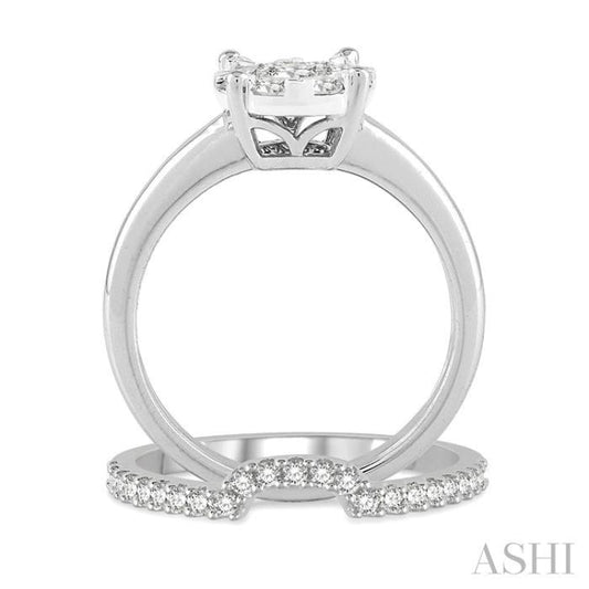 1/5 ctw Lovebright Round Cut Diamond Wedding Set With 1/8 ctw Circular Engagement Ring and 1/10 ctw U-Shape Center Wedding Band in 14K White Gold