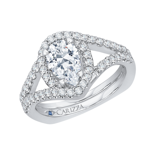 Split Shank Pear Shape Diamond Halo Engagement Ring In 14K White Gold (Semi-Mount)