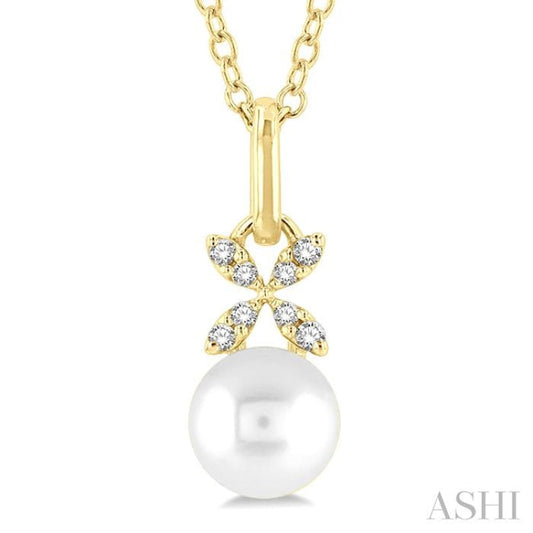 1/50 ctw Petite Floral Round Cut Diamond and 6X6 MM Cultured Pearl Fashion Pendant With Chain in 10K Yellow Gold