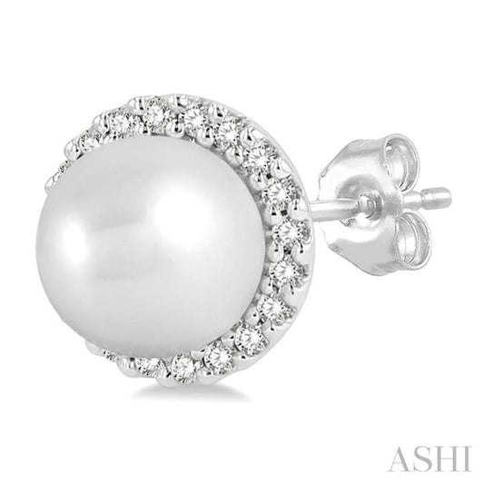1/8 ctw Petite 5.5 MM Cultured Pearls and Round Cut Diamond Halo Fashion Stud Earring in 10K White Gold