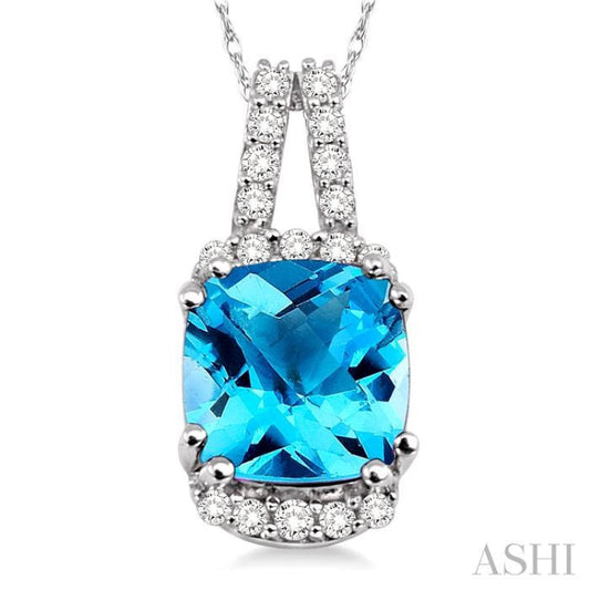 8x8 MM Cushion Cut Blue Topaz and 1/5 Ctw Round Cut Diamond Pendant in 14K White Gold with Chain