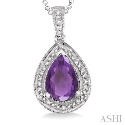 10x7 MM Pear Shape Amethyst and 1/20 Ctw Single Cut Diamond Pendant in Sterling Silver with chain