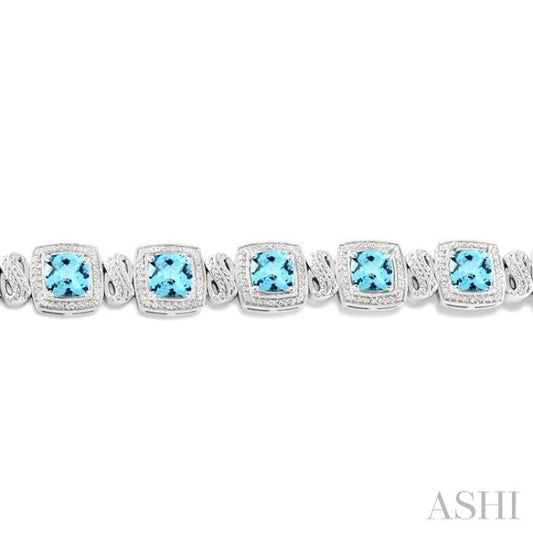 7x7 mm Cushion Cut Blue Topaz and 1/10 Ctw Single Cut Diamond Square Shape Bracelet in Sterling Silver