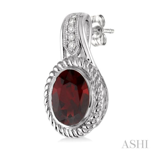 9x7 MM Oval Cut Garnet and 1/20 Ctw Single Cut Diamond Earrings in Sterling Silver