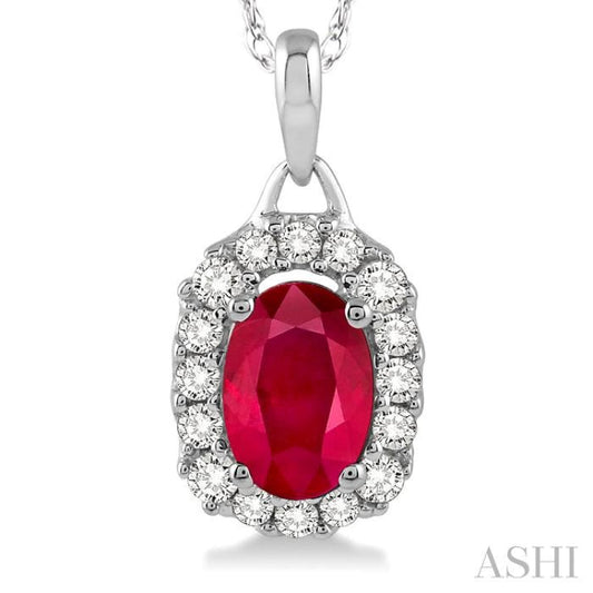 6x4 MM Oval Cut Ruby and 1/6 Ctw Round Cut Diamond Pendant in 14K White Gold with Chain