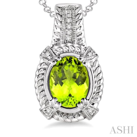9x7 MM Oval Cut Peridot and 1/50 Ctw Single Cut Diamond Pendant in Sterling Silver with Chain