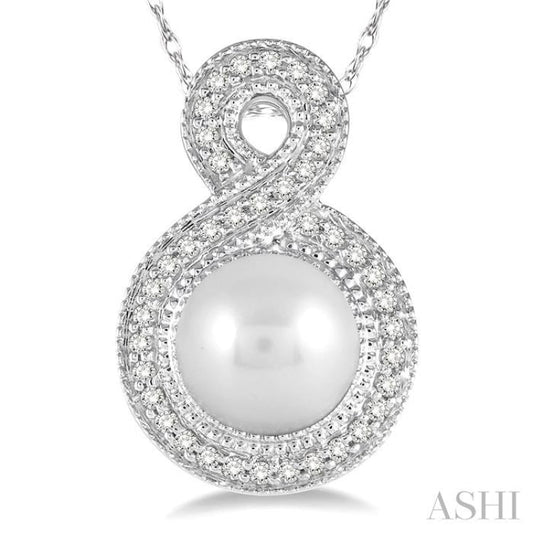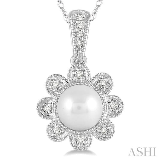7x7 MM Cultured Pearl and 1/6 Ctw Round Cut Diamond Fancy Pendant in 10K White Gold with Chain