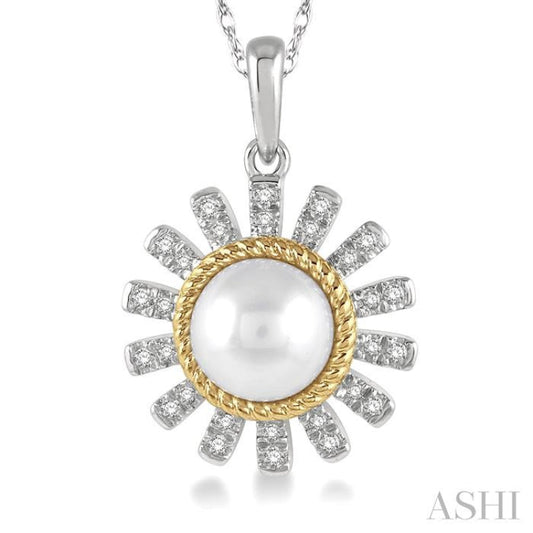 1/8 Ctw Sunflower 7x7MM Cultured Pearl & Round Cut Diamond Pendant With Chain in 10K White and Yellow Gold