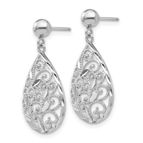14k White Gold Polished Filigree Teardrop Post Dangle Earrings