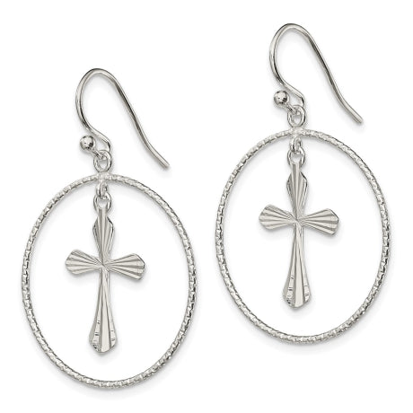 Sterling Silver Polished Diamond-cut Cross Dangle in Ring Earrings