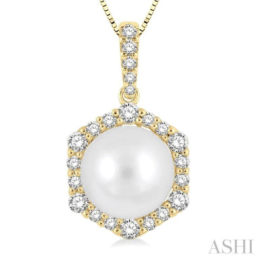 8X8MM Cultured Pearl and 1/3 Ctw Hexagon Shape Round Cut Diamond Pendant With Chain in 14K Yellow Gold