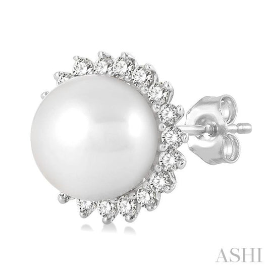 1/6 ctw Petite Sunflower 5.5 MM Cultured Pearls and Round Cut Diamond Fashion Stud Earring in 10K White Gold