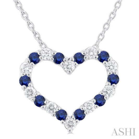 1/8 ctw Open Heart 1.4 MM Round Cut Sapphire and Round Cut Diamond Precious Fashion Pendant With Chain in 14K White Gold