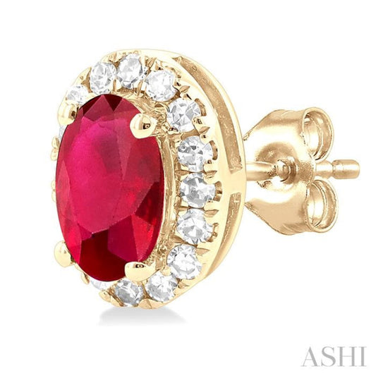 1/8 ctw Round Cut Diamond and 5X3MM Oval Shape Ruby Halo Precious Stud Earrings in 14K Yellow Gold
