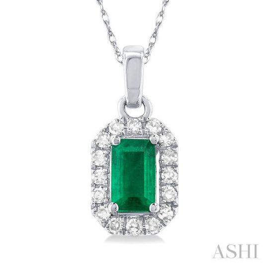 1/20 ctw Round Cut Diamond and 5X3MM Octagonal Shape Emerald Halo Precious Pendant with Chain in 10K White Gold