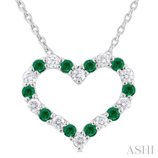 1/8 ctw Open Heart 1.4 MM Round Cut Emerald and Round Cut Diamond Precious Fashion Pendant With Chain in 14K White Gold