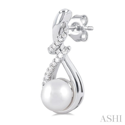 1/6 ctw Swirl Top 6X6 MM Cultured Pearl and Round Cut Diamond Fashion Earring in 10K White Gold