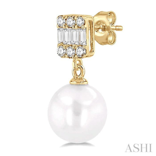 6MM Cultured Pearls and 1/10 ctw Baguette and Single Cut Diamond Earring in 10K Yellow Gold