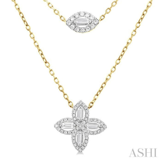 1/2 ctw Floral Baguette and Round Cut Diamond Layered Fashion Necklace in 14K Yellow Gold