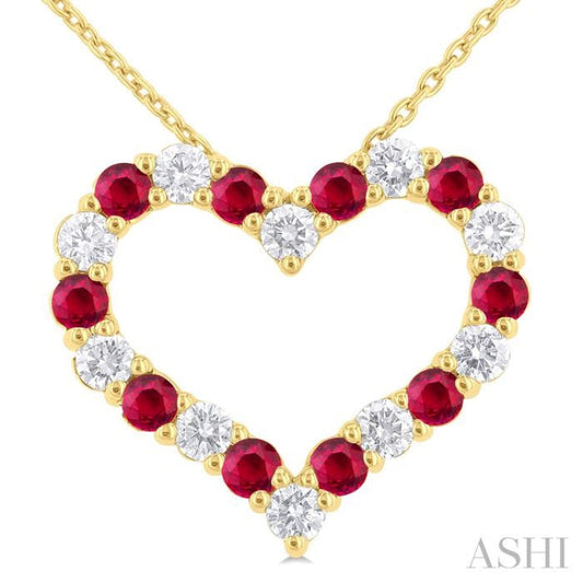 1/2 ctw Open Heart 2.3 MM Round Cut Ruby and Round Cut Diamond Precious Fashion Pendant With Chain in 14K Yellow Gold