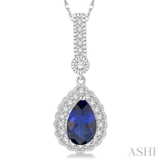 7x5 MM Pear Shape Sapphire and 1/5 Ctw Round Cut Diamond Pendant in 14K White Gold with Chain