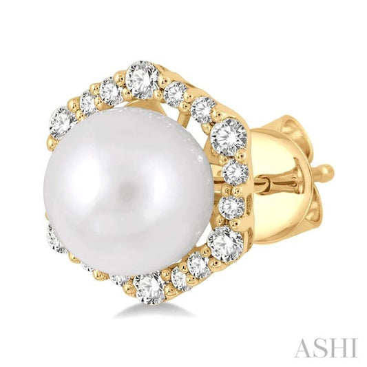 7X7MM Cultured Pearls and 1/3 Ctw Hexagon Shape Round Cut Diamond Earrings in 14K Yellow Gold