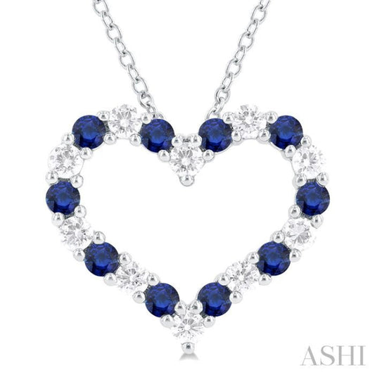1/2 ctw Open Heart 2.3 MM Round Cut Sapphire and Round Cut Diamond Precious Fashion Pendant With Chain in 14K White Gold