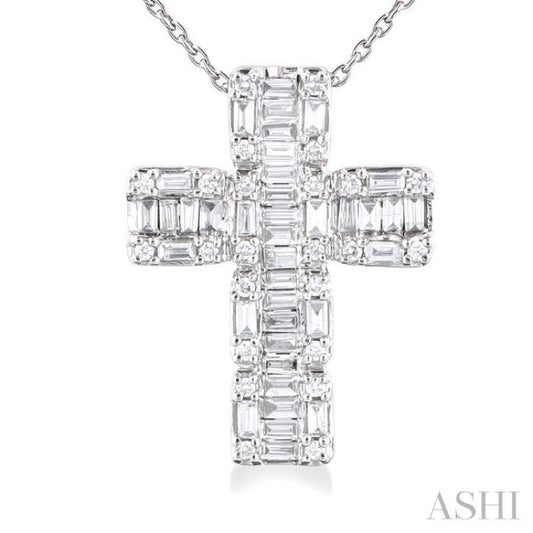 1/2 ctw Fusion Baguette and Round Cut Diamond Cross Fashion Pendant With Chain in 14K White Gold