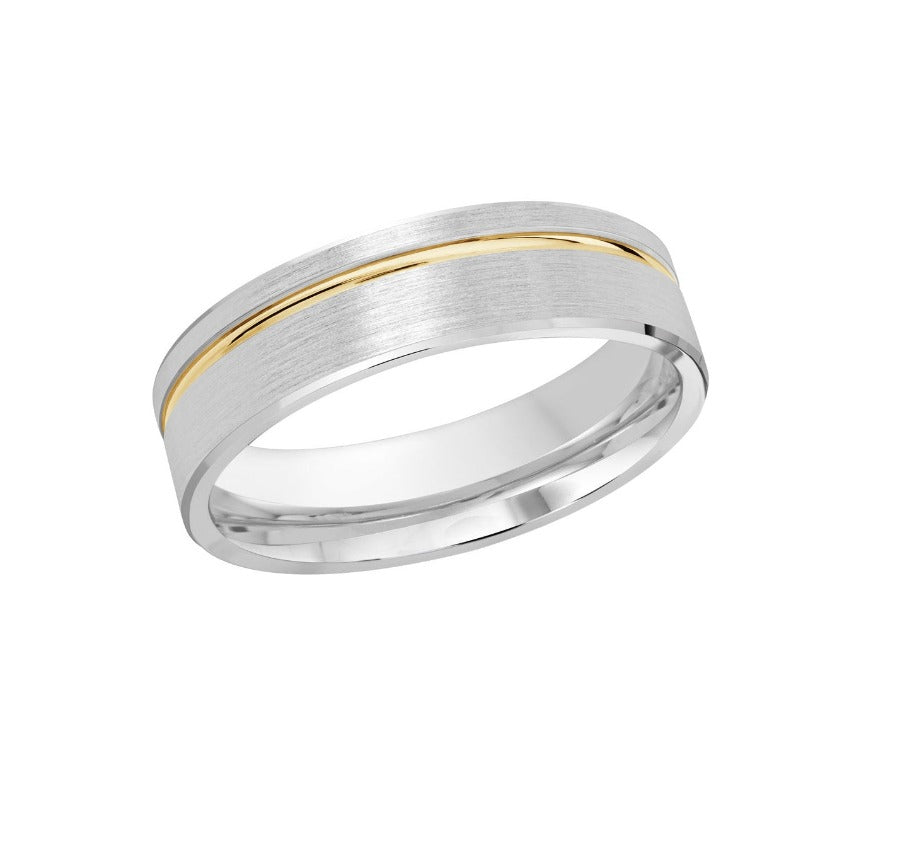 This stunning 6mm white gold wedding ring with a satin finish features a yellow gold high polish groove situated on the top half of the ring and is finished off with thin high polish edges.