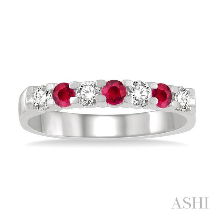 Add color and distinction, with a wedding band that includes other precious stones along with diamonds, just like this one here. The wedding band features an alternate layout of Rubies and diamonds. 4 prong set round cut diamonds are separated by 3 prong set 2.6MM round cut Rubies. With a touch of red color and the sparkle of diamonds plus the beauty of white gold, combine to offer a marvelous look to this precious stone wedding band. Not only is it different, but also beautiful. The diamond wedding band is carved in 14 karat white gold. Total diamond weight is 1/4 ctw and round cut Ruby measures 2.6mm.