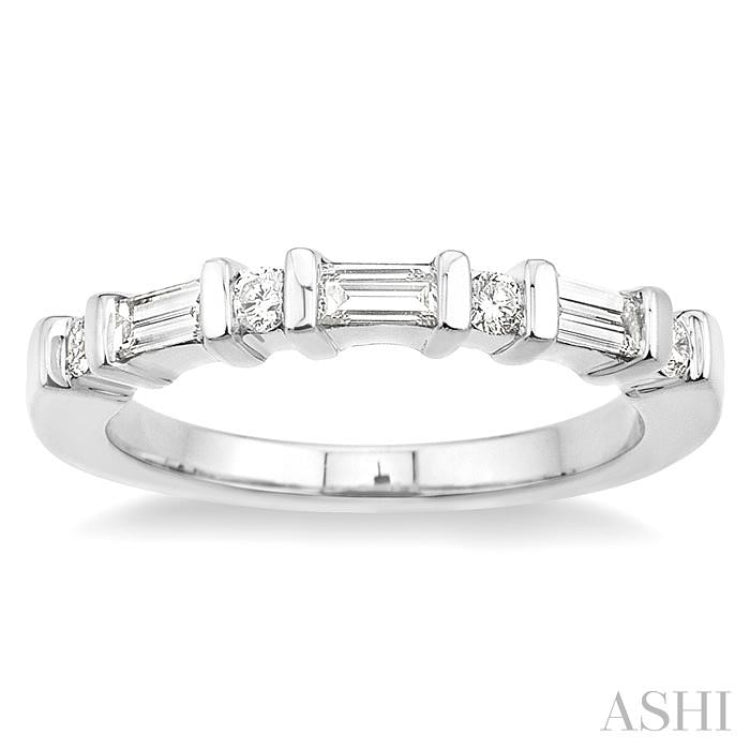 A gorgeous diamond wedding band, this catches the eye without fail. Its fabulous setting that is simple yet so starkly impressive, makes it a desirable piece. The wedding band features an attractive layout of baguette and round cut diamonds. There are 3 fancy baguette diamonds, which is segregated by a channel set round cut diamonds, a total of 4 diamonds, 1 each between each baguette row. The pattern thus created is quite stunning. The wedding band is sculpted in 14 karat white gold. Total diamond weight is 1/2 ctw.