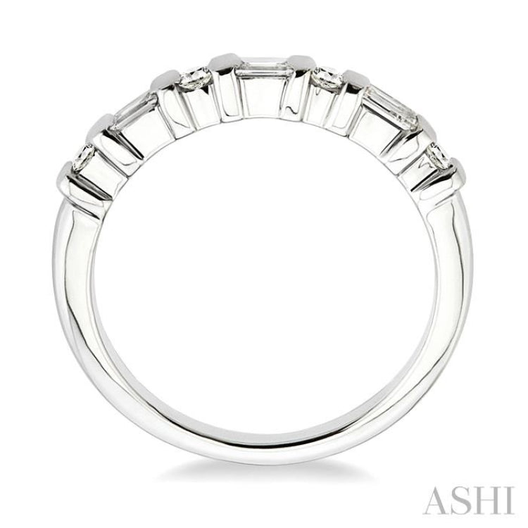 A gorgeous diamond wedding band, this catches the eye without fail. Its fabulous setting that is simple yet so starkly impressive, makes it a desirable piece. The wedding band features an attractive layout of baguette and round cut diamonds. There are 3 fancy set baguette diamonds, which is segregated by a channel set round cut diamonds, a total of 4 diamonds, 1 each between each baguette row. The pattern thus created is quite stunning. The wedding band is sculpted in 14 karat white gold. Total diamond weight is 1/4 ctw.