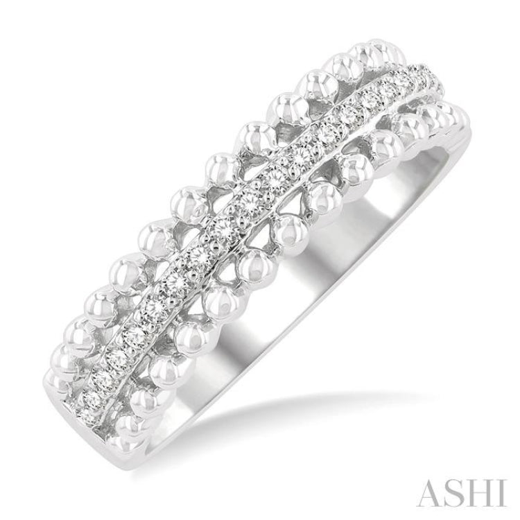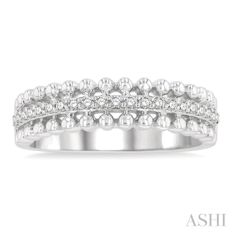 A smart diamond fAshion band that also works great as a wedding band. Its simple but artistic layout offers aesthetic appeal. The band features a sleek row of 21 prong set round cut diamonds, running along the center of the ring. Flanking the diamond row is a ball bead border, with small gold beads connecting in a straight row. The diamond fAshion band is molded in a rhodium finish 14 karat white gold. Total diamond weight is 1/5 ctw.