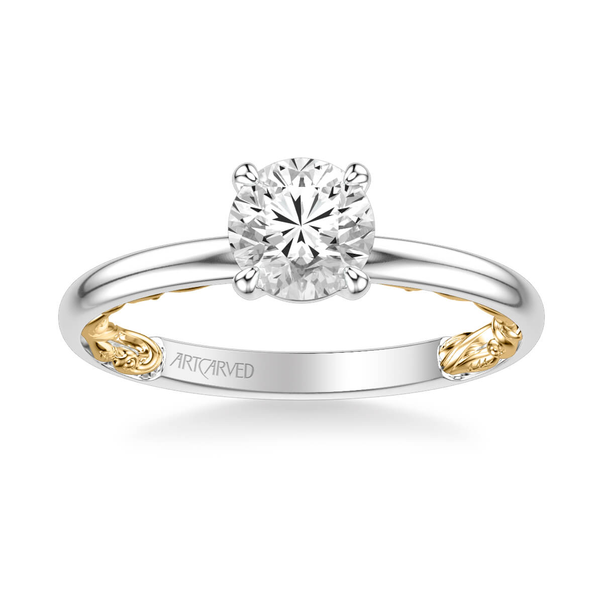 This Solitaire Diamond Engagement Ring from our Lyric Collection is thoroughly modern but steeped in history. The interior of this classic high polish band is intricately hand carved by our artisans with a floral pattern inspired by our original iconic designs. The gently curving pattern lovingly hugs the finger, adding a pop of color and intrigue. This stunning ring will hold a special place in your heart . . . for eternity.