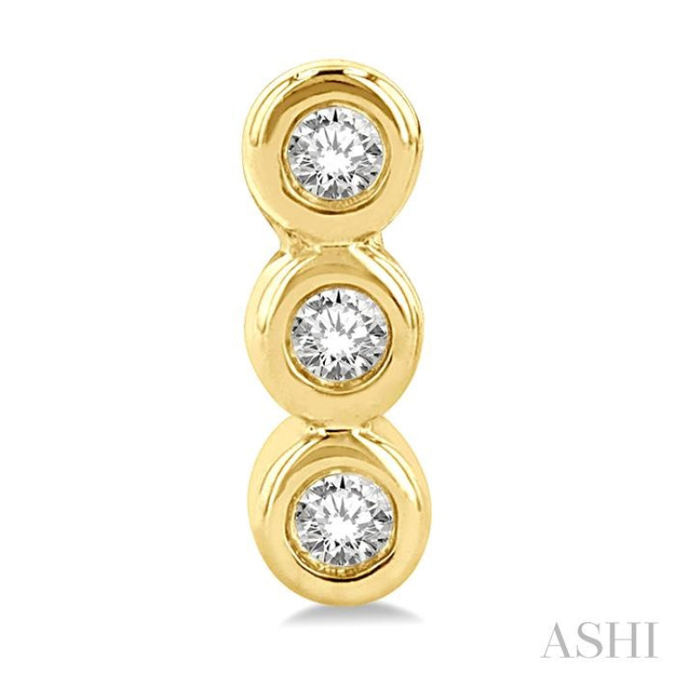 Simple yet smart, these Petite diamond stud earrings catch the eye instantly. They are great for everyday wear. The earrings feature three jointed round mounts each, with round cut diamonds decorating them. Each mount is embellished with a bezel set round cut diamond, a total of 6 diamonds on both earrings. An earnut closure makes it easy to slip on the earring, which is fAshioned in 10 karat yellow gold. Total diamond weight is 1/10 ctw.