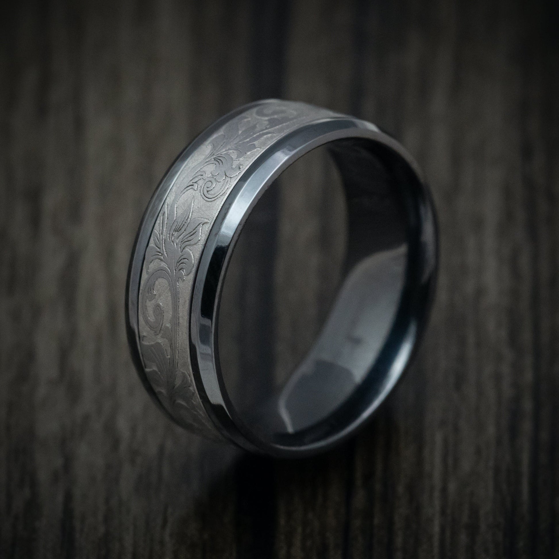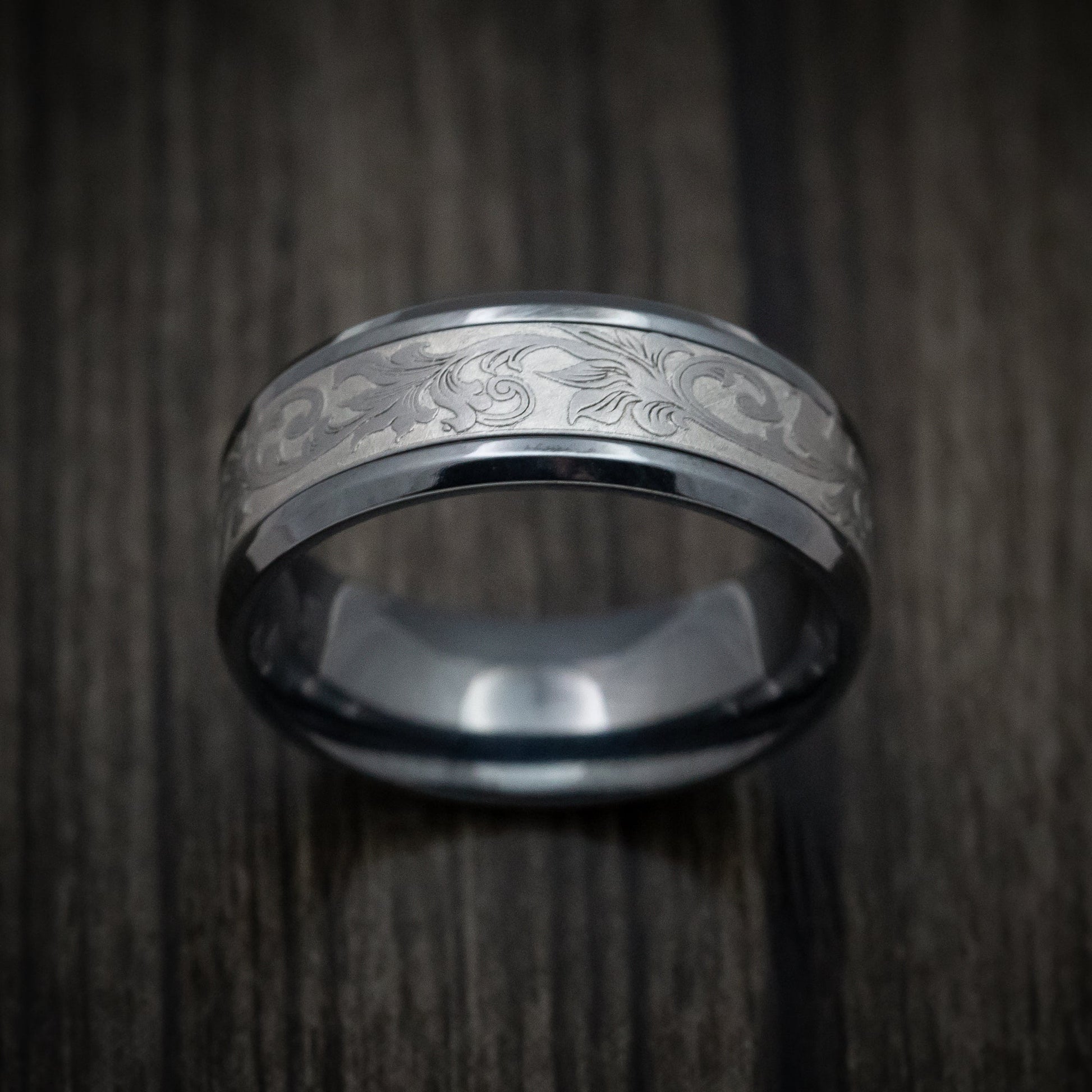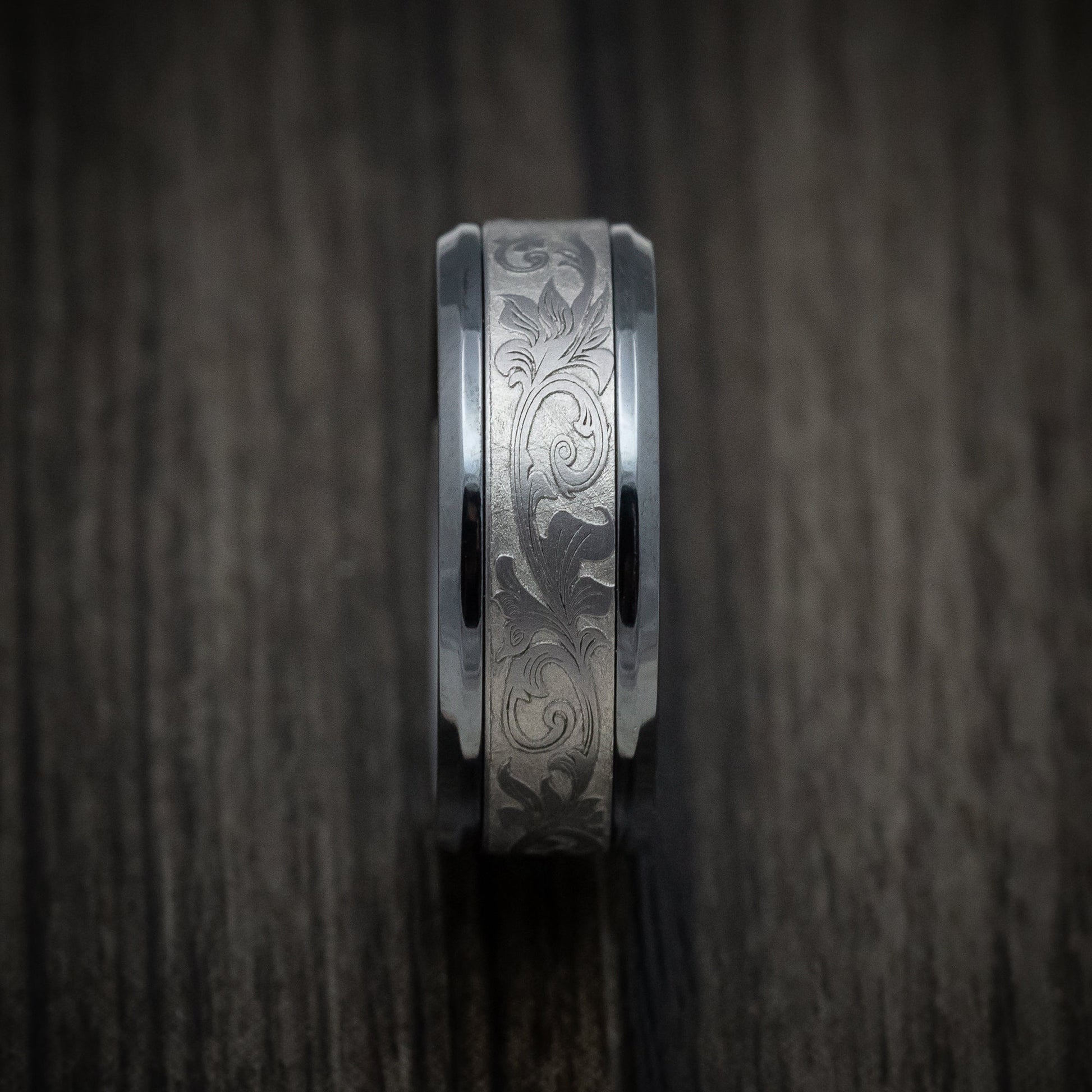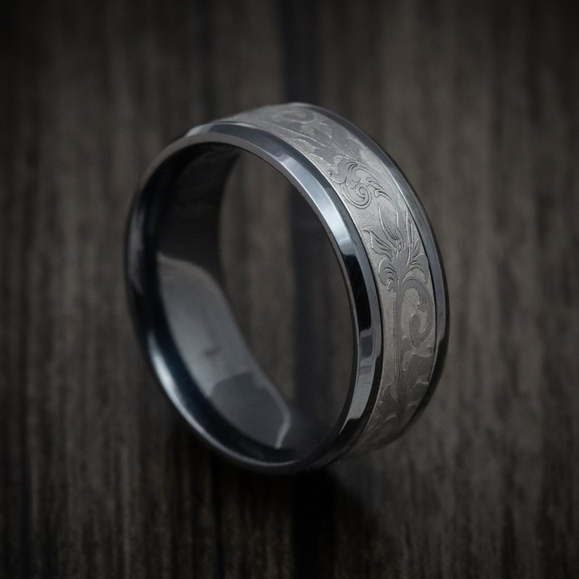 Black Titanium and Tantalum Mens Ring with Vintage Floral Design