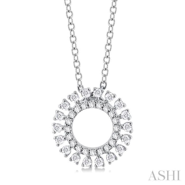 The circle has no end or beginning, it continues in a loop, it is eternal. As such, gifting a circle pendant to a loved one, suggests an eternal love, a bond that is sealed for eternity. This lovely circle pendant makes for a fine choice. It is aesthetically appealing and well-crafted, making it a good addition to one's jewelry box. The pendant features a circular shape, with diamond extensions giving it a floral look. 20 prong set round cut diamonds embellish the main circle, while 18 prong set round cut diamonds stand individually, forming a halo around the circle. An CAT23 chain attaches to the pendant, both of which are molded in a rhodium finish 10 karat white gold. Total diamond weight is 1/4 ctw.
