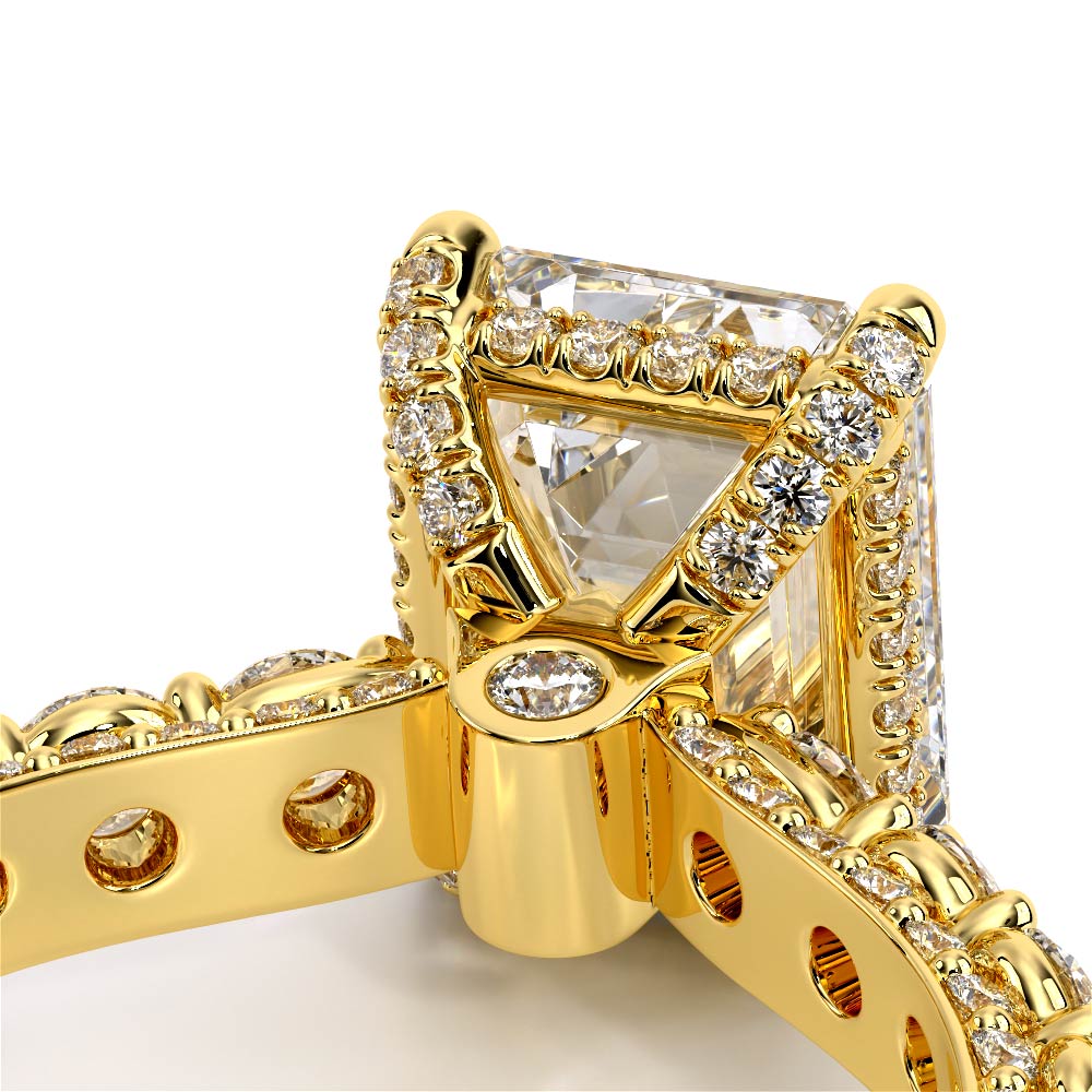 Couture-0489EM-2.5 is an elevated four-prong engagement ring featuring a diamond-bridge head designed to highlight your center stone. Meticulously-set round diamonds in a shared-prong setting wrap the elegant shank, enhanced with a pave-set three-quarter diamond riviera. The Verragio signature crest completes the statement look.