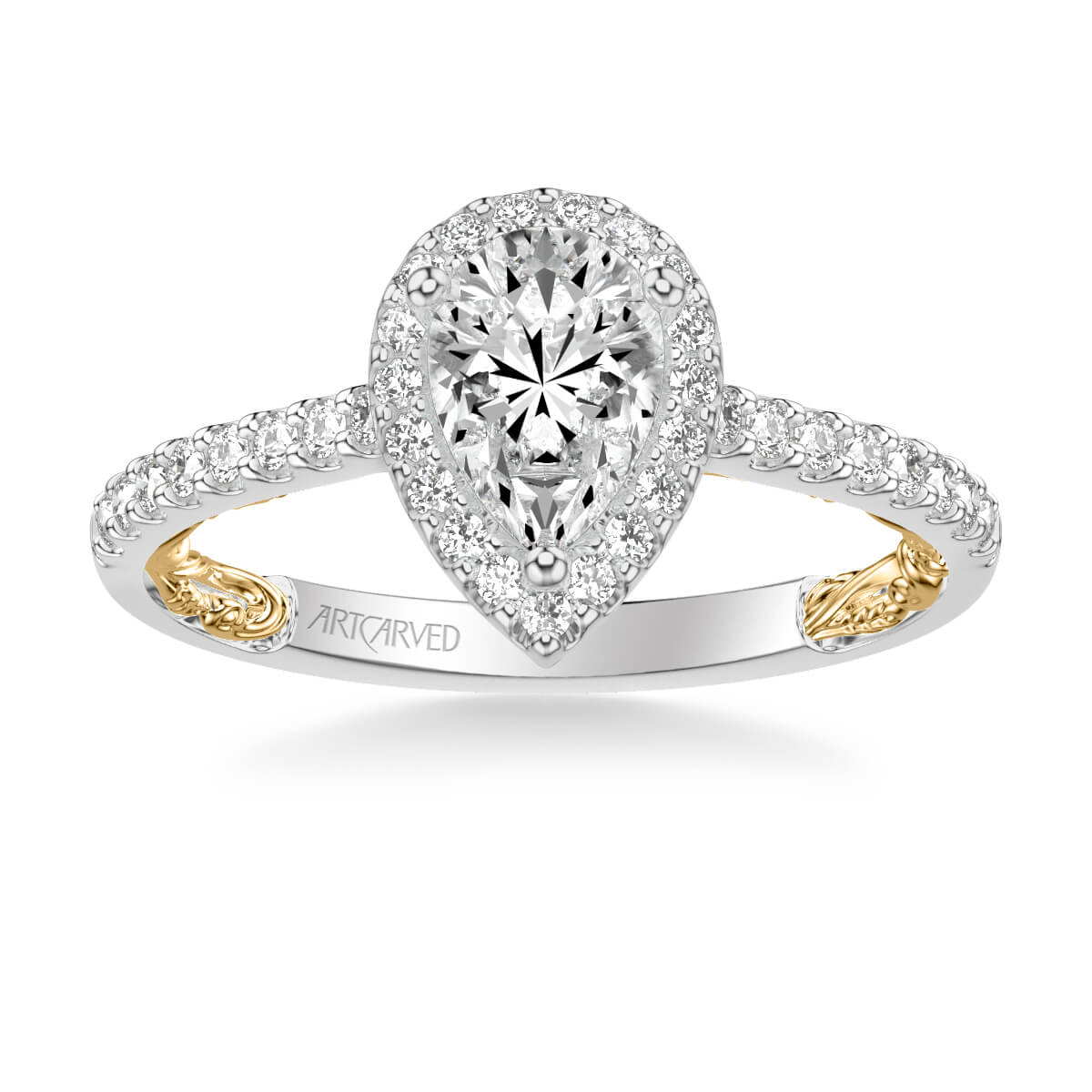 This Pear Halo Diamond Engagement Ring from our Lyric Collection is thoroughly modern but steeped in history. The interior of this classic diamond band is intricately hand carved by our artisans with a floral pattern inspired by our original iconic designs. The gently curving pattern lovingly hugs the finger, adding a pop of color and intrigue. The diamond accented gallery adds even more sparkle. This stunning ring will hold a special place in your heart . . . for eternity.