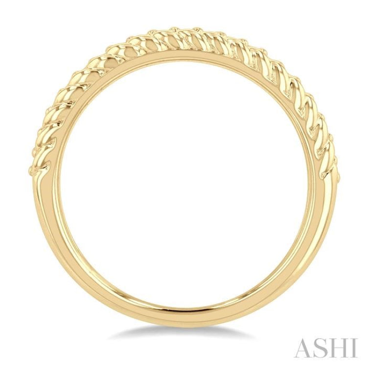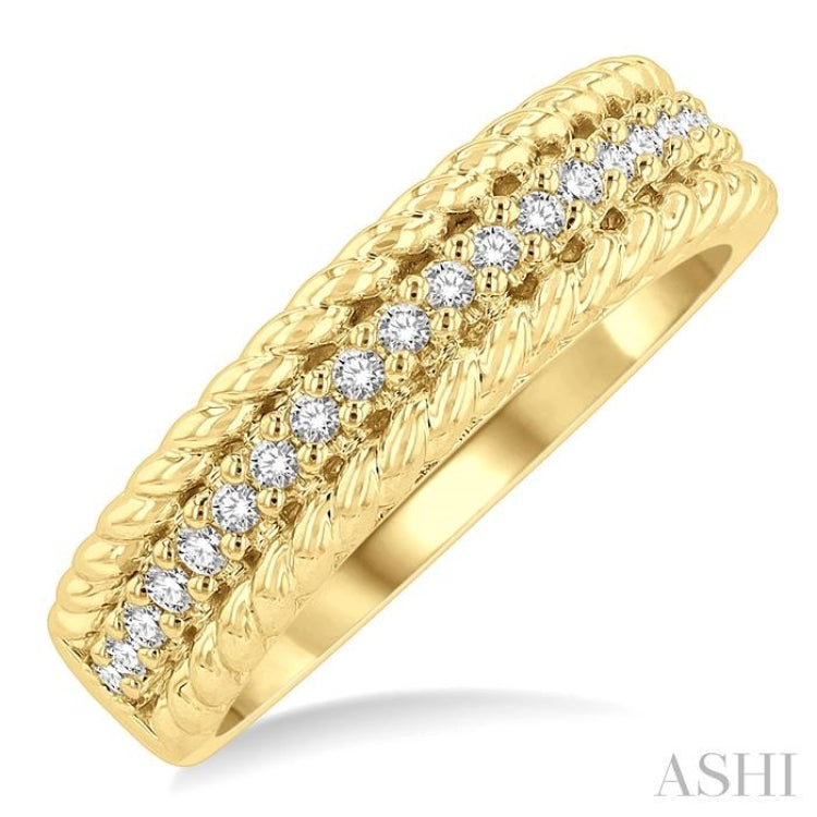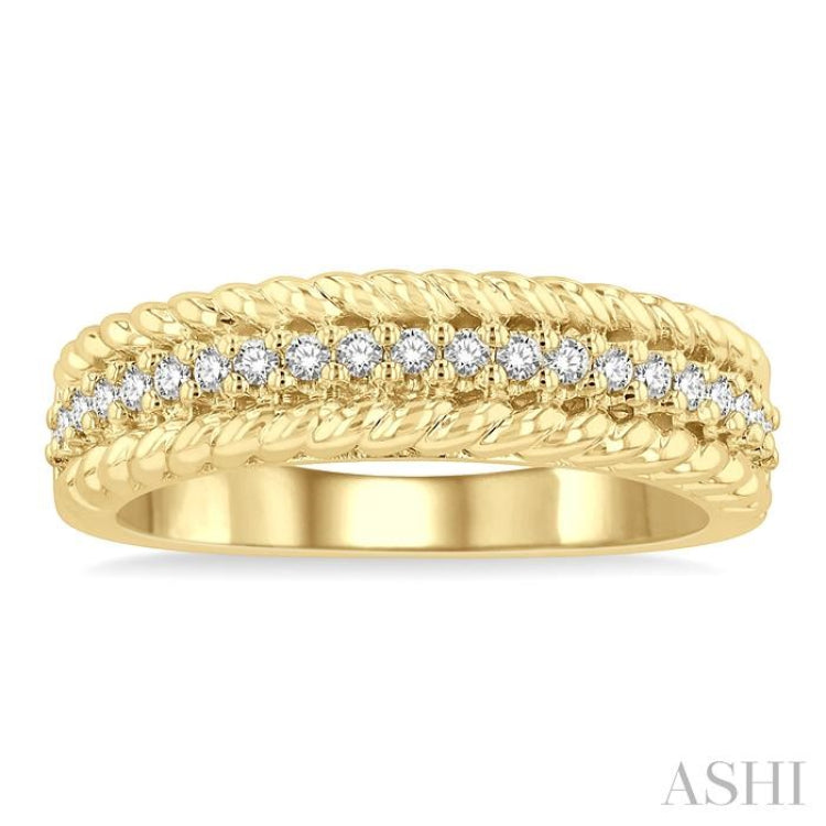 A simple but chic design highlights the beauty of this diamond fAshion band. It also makes a fine wedding band option. The ring features a stylish layout of diamonds and twisted rope. There is a row of 21 prong set round cut diamonds running through the center of the ring. On either side of the diamond setting, is seen a border of twisted gold rope. The diamond fAshion band is styled in 14 karat yellow gold. Total diamond weight is 1/5 ctw.